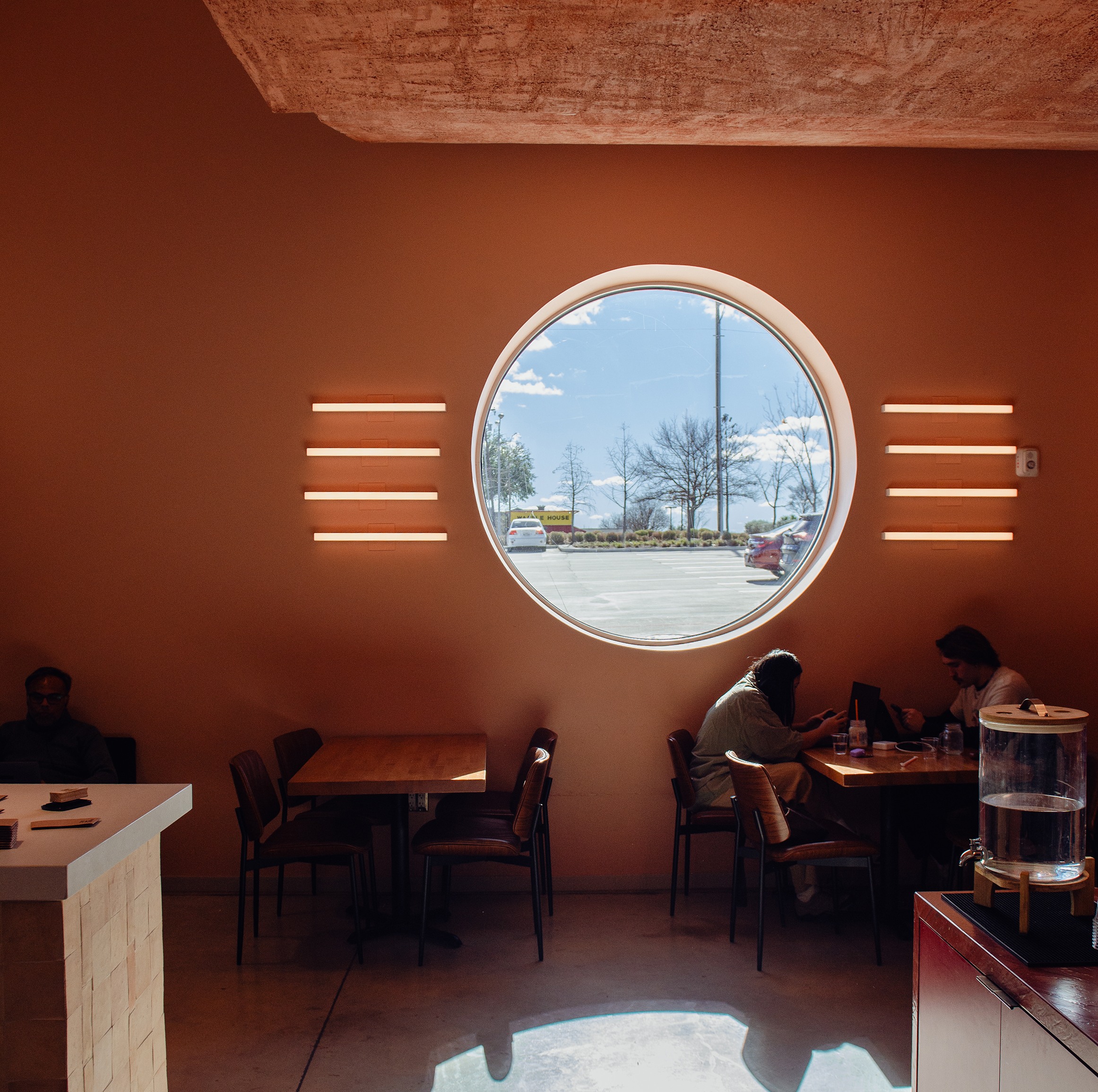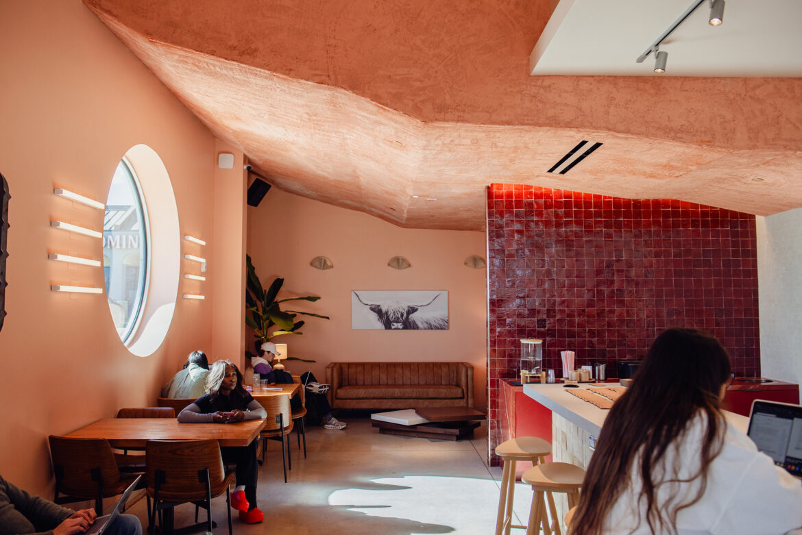 “Natural, variegated textures are key to successful execution of a desert aesthetic. The Cliff ceiling was troweled by a local plaster installer. We went through many test runs getting the right color and texture,” says Sara Barnes of Agent Architecture, who designed the space. “The clay tilework on the walls has that imperfect variation to it, which is just so wonderful and character-giving. People are tired of being in manufactured, cookie-cutter spaces. This coffee shop design really decries that, which is part of why it feels so good.”