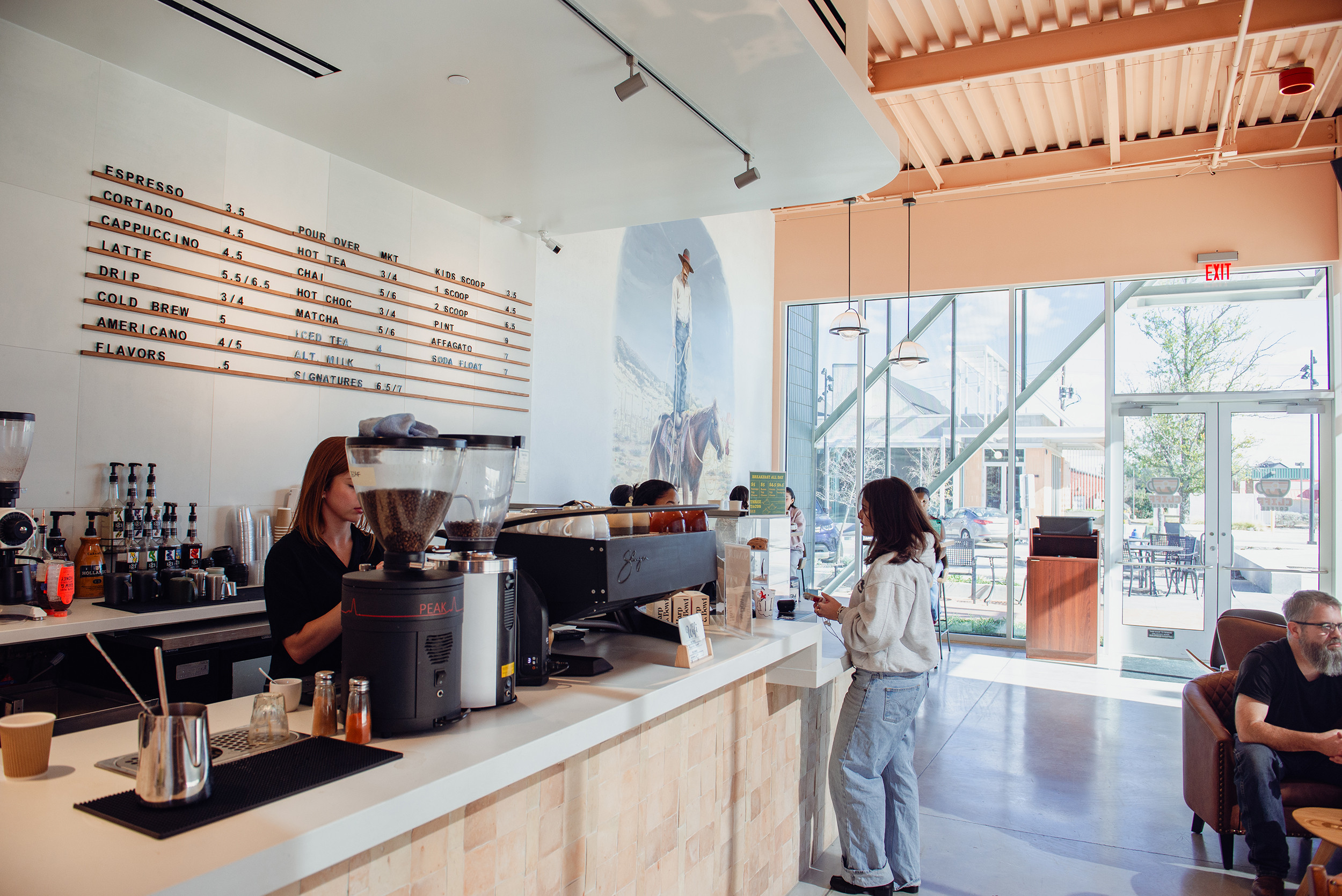 Assembly Park’s Cliff Coffee is all southwestern vibes. To the left, a cactus sculpture. To the right, a mural of a cowboy standing on a horse. All around, sandy tones and stone-like textures emulate the New Mexico landscape.